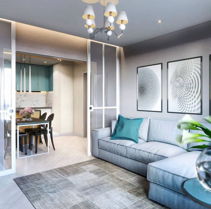 Еще один отличный вариант зрительно поделить комнату на две функциональные зоны – использовать разную цветовую гамму. Например, вы можете покрасить стены в гостиной в другой цвет или выбрать для интерьера яркую мягкую мебель. Также на помощь придет цветной ковер, если вы планируете дополнять им обстановку.
