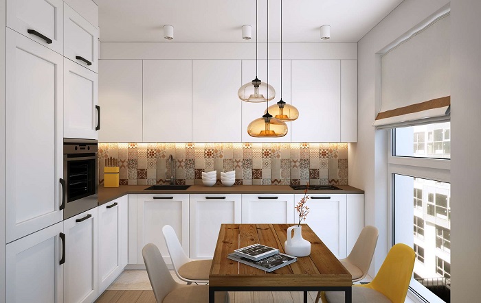 Так как после объединения кухни и гостиной вы получите одну большую комнату, нужно будет установить несколько светильников, которые смогут дать достаточное количество света. Одной потолочной люстры явно будет недостаточно, так как она «захватит» лишь небольшую часть помещения. В результате в комнате будут темные углы, глаза постоянно будут напрягаться, а обстановка комнаты станет мрачной и неприветливой. Однако установка большого количества спотов по всему периметру потолка также является не самым лучшим решением – такой прием делает комнату скучной и плоской, лишает ее уюта.