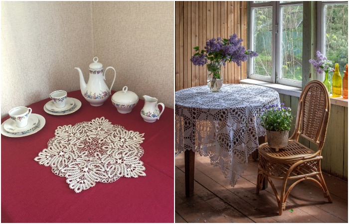 Кружевные салфетки и скатерти – это не пережиток прошлого и не «бабушкин» дизайн. Они становятся настоящим украшением кухни, ее характерной особенностью, деталями, которые привлекают взгляд и вызывают восхищение. Такой декор прекрасно впишется в стиль кантри, прованс или шебби-шик. Сочетайте его с деревом, голубыми и зелеными оттенками. Кстати, кружевные салфетки можно использовать не только по прямому назначению: поставьте их в рамки или закрепите на наволочки – получится очень оригинально.