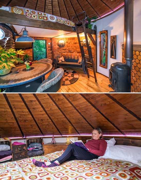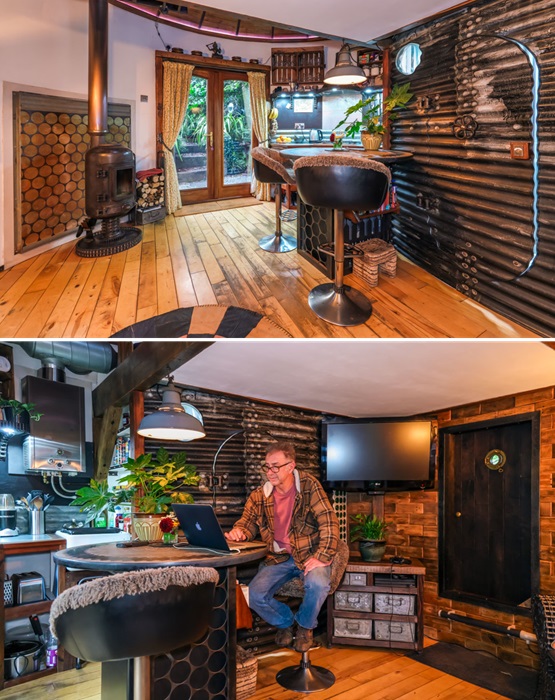 Это лишь малая толика неожиданных преобразований, хотя каждая даже самая маленькая деталь была изготовлена с выдумкой и любовью каждого участника проекта. Кэрол также вносила свою лепту в преобразования, подбирая и подготавливая старые доски к отделочному процессу, очищая стальные элементы от ржавчины, участвуя в разработке дизайна интерьера и т. д. В итоге и творческой пары получился уютный домик, в котором они обитают уже вот уже 6 лет, наслаждаясь красотой окружающей растительности и пением птиц, как и мечтала спутница Боба.