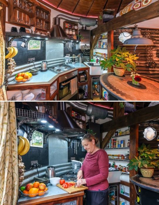 Кстати сказать, мягкую мебель они также не покупали. В гостиной традиционный диван прекрасно заменяет заднее сиденье винтажного Volkswagen Beetle, к которому приделали роскошные фигурные боковины, попутно выступающие в роли больших подлокотников. А вот потрепанные барные кресла, Кэрол обшила накидками из искусственного меха, что сделало их и привлекательными, и очень теплыми. Бобу удалось пристроить и выхлопную трубу от большого грузовика, которая служит одним из компонентов воздуховода, установленного на газовой плитой.