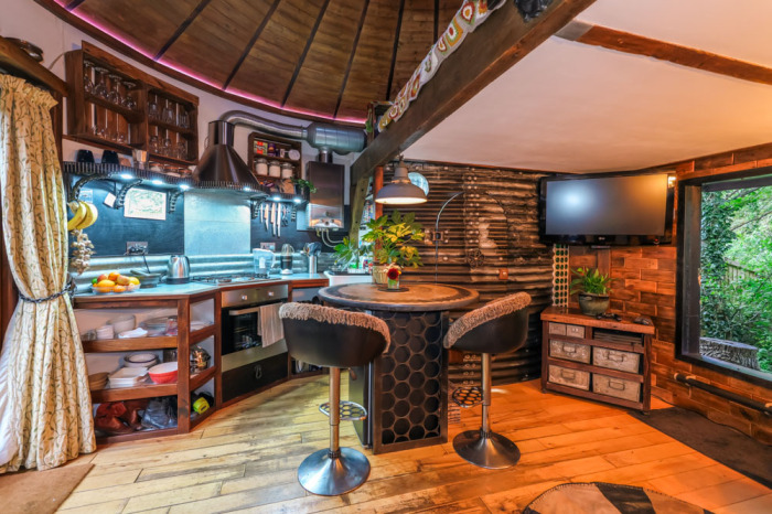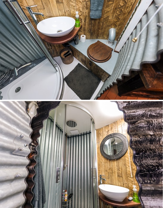 Учитывая, что диаметр стальной оболочки составляет 4 метра и никаких пристроек нет, имеющееся пространство имеет открытую планировку. При этом 4-метровая высота силосной башни позволила разделить ее на два уровня, чтобы втиснуть все необходимые жилые зоны не создавая тесноты. Низ преображенного зернохранилища занимают гостиная, кухня, столовая и ванная, а лофтовый уровень отдан под организацию спальной зоны. Чтобы задействовать каждый сантиметр имеющейся площади окружности, Боб самостоятельно изготовил кухонный гарнитур и другие предметы мебели, которые требовалось установить вплотную к округлым стенам.