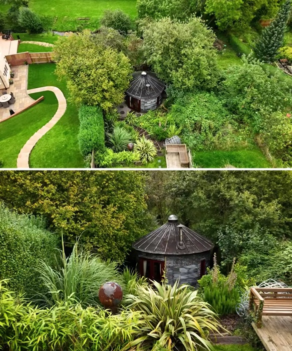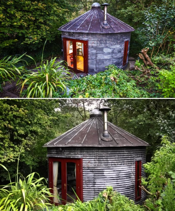 Даже старая силосная башня, которая когда-то служила зернохранилищем может стать вдохновением для творческих людей. Таких, как Боб и Кэрол, которые приложили массу усилий, чтобы металлический объем превратился в очаровательную обитель, наполненную потрясающими особенностями. А как это им удалось – далее в нашем обзоре. Даже оболочка силосной башни может стать вдохновением. | Фото: youtube.com. Никогда не знаешь, что может вдохновить на реализацию удивительного проекта, особенно если имеется творческая жилка, как у британца Боба Кэмпбелла – талантливого художника, скульптора, дизайнера мебели и невероятных вещей, которые он делает собственными руками из хлама. Однажды, просматривая страницы сайтов, его внимание привлекло объявление на eBay, где всего за 1 фунт стерлингов (1,2 евро) продавали старую силосную башню, которая когда-то была зернохранилищем. Обсудив перспективу использования столь неожиданного приобретения со своей спутницей жизни Кэрол Энн, они привезли ее, чтобы установить в саду домовладения в Дербишире. Боб и Кэрол превратили зернохранилище в уютное убежище. | Фото: livingbiginatinyhouse.com. Уже тогда у пары энтузиастов возникла идея превратить зернохранилище, изготовленное в виде конического цилиндра из толстой стали, в летний домик для отдыха. Сама оболочка силоса имела довольно внушительные размеры – 4 метра в диаметре и столько же в высоту, что вдохновляло на преобразования, которыми в большей мере загорелась Каролина, мечтающая не просто отдыхать на природе в выходные дни или праздники, а жить среди растений, наслаждаясь пением птиц ежедневно. Из силосной башни получился крошечный домик. Преобразования начались с более прозаического, но не менее важного процесса – заливки круглой платформы, которая и стала своеобразным фундаментом для будущего убежища. Этой работой занимался Боб, хотя и был не очень уверен в положительном исходе затеи. Хотя когда их «Промышленный замок», именно так между собой называли энтузиасты силосную башню, занял свой «подиум», творческая фантазия подогрела интерес к проекту, выдавая все новые и новые идеи. А вот реализовывать самые безумные задумки из самых неожиданных вещей мужчина умел как никто другой. Как признается Боб, для своих художественных композиций он никогда не использовал новые материалы или изготовленные на заказ детали, он предпочитал обойти все мусорные свалки в округе и найти то, что после его вмешательства превращалось в потрясающие предметы/экспонаты. Вот и будущий домик не стал исключением, а превратился в экспериментальную мастерскую, где вход шло все – от деталей старой мебели до газового баллона и цепей. Стальную оболочку пришлось разрезать и собирать заново. Примечательно: Перевезти целиком силосную башню в дальний угол заднего двора не удалось из-за большого веса и объема структуры. Ни домкраты, ни кантование не помогли бы справиться с этой задачей, поэтому Боб принял решение разрезать оболочку на фрагменты, а затем их перевезти, собрать и закрепить в нужном месте. Это позволило прямо на земле вырезать в центре конической «крыши» световой люк, ну а остальные проемы появились уже после полного восстановления конструкции зернохранилища. «Промышленный замок» установили среди роскошного сада. На заднем дворе полно композиций из хлама, сделанных руками Боба. Когда с
