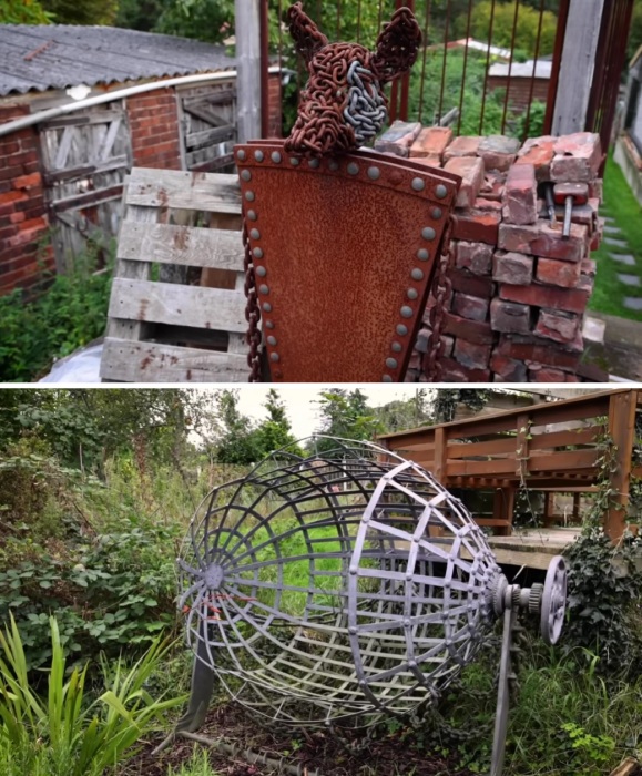 На заднем дворе полно композиций из хлама, сделанных руками Боба.