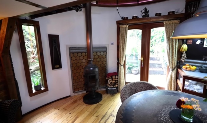 Когда стальная оболочка оказалась в нужном место, пара занялась утеплением стальной конструкции, чтобы облегчить процесс поддержания комфортной температуры внутри убежища в любое время года и погоду. Это, пожалуй, единственный процесс, потребовавший значительных финансовых вливаний, остальное же обошлось даром, поскольку использовались вторсырье и переработанные материалы: восстановленная древесина, предметы с мусорных полигонов или отданные друзьями, родственниками, соседями. Так с газового баллона, например, появился прекрасный дровяной камин, а со старого пильного полотна и цепи получилась удивительная столешница, правда, они были «инкрустированы» в бетонный круг.