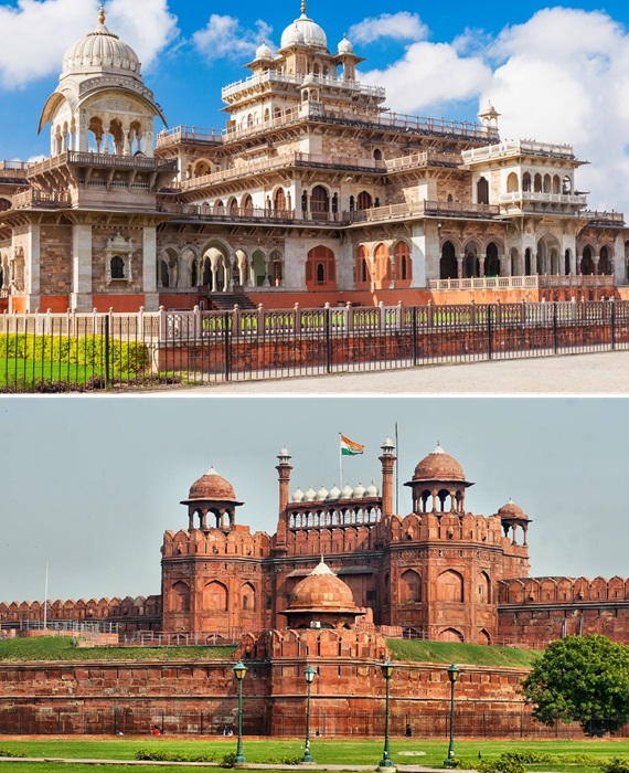 Расположенный в самом сердце Джайпура, «Дворец ветров» (Hawa Mahal) является одним из самых знаковых и узнаваемых архитектурных ансамблей города. Построенный в 1799 году по приказу махараджа Савая Пратапа Сингха, он отличается впечатляющим пятиэтажным фасад, украшенным 953 выступающими эркерами, называемыми джхарокхами. Разделенные на маленькие ячейки и прикрытые вычурными орнаментами, они служили наблюдательным пунктом для женщин королевской семьи, которые могли подглядывать за городской жизнью, при этом оставаясь незамеченными. Помимо этого решетчатые отверстия обеспечивали циркуляцию воздуха, создавая освежающую атмосферу, которой так не хватало в жарком климате Раджастхана. • «Городской дворец»