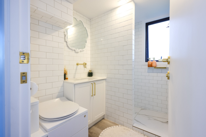 Не менее впечатляет то, куда дуэт пристроил прекрасную ванную комнату. Белоснежная глянцевая керамическая плитка модели метро, уложенная в шахматном порядке, в такой же цветовой гамме тумба со встроенной раковиной нестандартного размера, большое зеркало необычной формы, просторная душевая, открывающееся окно, биотуалет, стиральная машина с функцией сушки, шкаф-пенал для хранения – все это делает ванную одновременно практичной и изысканной.