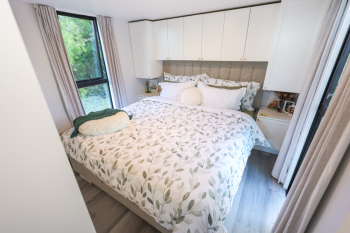 В это сложно поверить, но супруги умудрились организовать одну спальню на нижнем уровне. Хейден – большой почитатель минимализма и скандинавского стиля, грамотно использовал торцевую часть. Выделив чуть больше места, он смог изготовить встроенную гардеробную, чтобы отказаться от громоздких шкафов в остальном жилом пространстве. Плюс ко всему он задействовал стену над изголовьем кровати, закрепив вместительные шкафы.