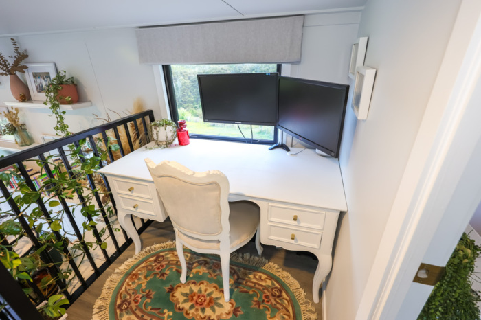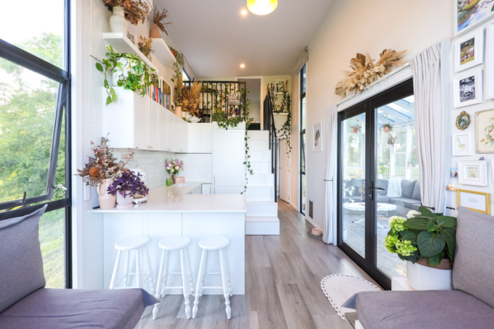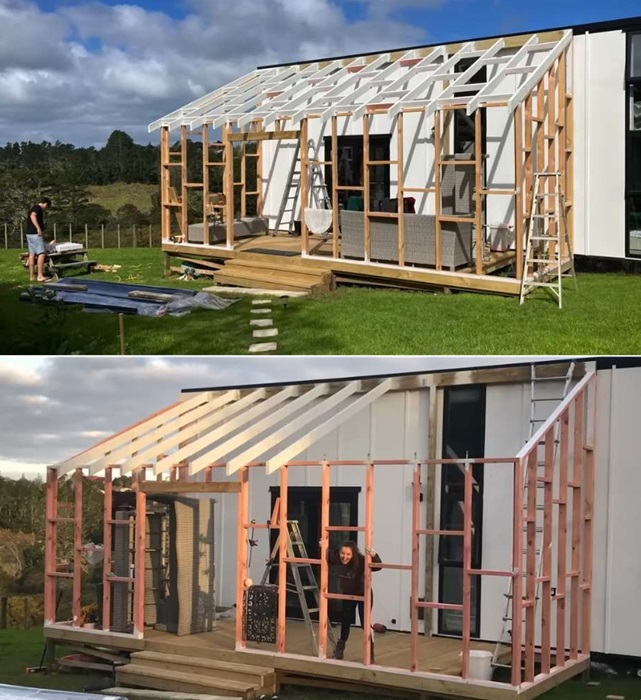 Примечательно: При размерах основного дома 10 х 3 метра (длина и ширина соответственно) пристройка с многофункциональной оранжереей имеет чуть меньшую площадь. Она, как и жилище, установлена на деревянной платформе, закрепленной на винтовых сваях, которые немного приподнимают их над землей. Из-за небольшого склона их высота имеет разное значение, что позволило без дополнительных затрат выровнять площадку. Поскольку Кэтрин мечтала о собственном зимнем саде, три стены и потолок сделали полностью стеклянными.