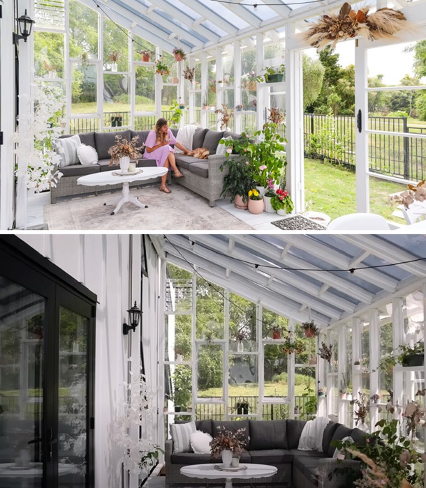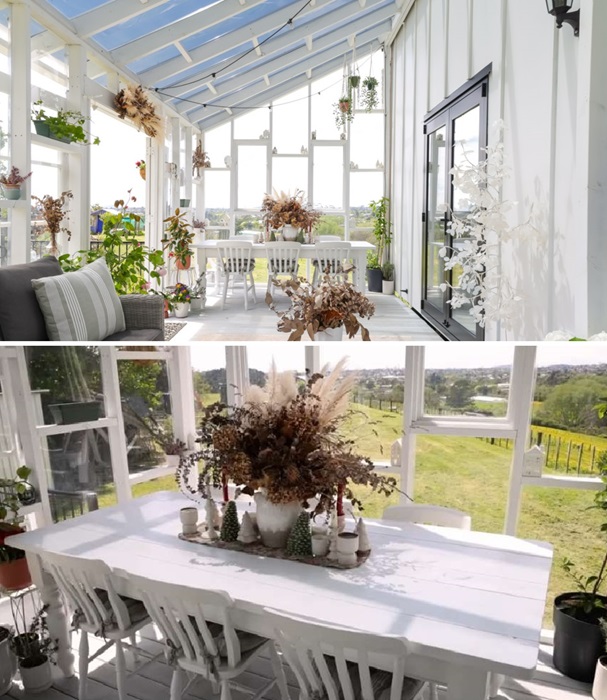 Масштабное остекление наполнило пристройку и сам домик светом, при этом размыло границы между внутренним пространством и живописным ландшафтом без ущерба для комфорта жильцов. И пусть в зимнее время или в знойный период лета в этой части не совсем комфортная температура (хотя кровля и затонирована), но это, куда лучше, чем продуваемая всеми ветрами открытая терраса. Тем более, что стеклянные панели прекрасно спасают и от дождя, позволяя наслаждаться отдыхом в прекрасном окружении. И пусть многие композиции Кэтрин сделала из сухоцветов и предпочла суккуленты, от этого атмосфера не становится менее приятной. Как отмечает хозяйка, еще одним плюсом наличия оранжереи является возможность сушки белья, которое после стирки не нужно вешать на улице, беспокоясь и том, что оно попадет под дождь.