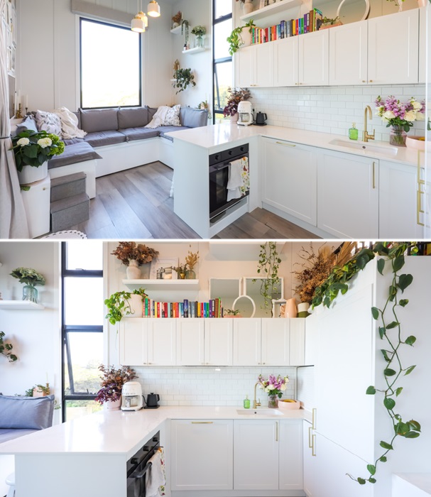 Стоит отметить, что при оформлении крошечного жилища креативные супруги проявили чудеса изобретательности и недюжинный дизайнерский талант. Это помогло им стать обладателями уютного и современного дома. Несмотря на более чем достаточную высоту, основное жилое пространство предусматривает открытую планировку, обилие белого цвета и щедрое остекление. Сразу за большой стеклянной дверью находится современная кухня с белоснежным мебельным гарнитуром, сделанным на заказ. Г-образная форма столешницы позволила не только вместить все необходимое оборудование и устанавливать нужную технику, но и организовать обеденную зону, которую можно использовать в качестве рабочей поверхности во время приготовления пищи, и места для работы или рукоделия.