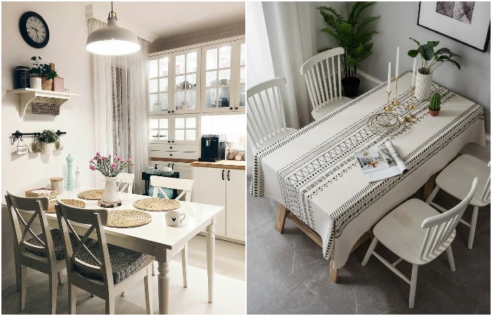 Даже если вы не собираетесь завтракать и не ждете в гости друзей или родственников, не стоит оставлять стол на кухне пустым. Застелите его красивой скатертью, разложите плетеные салфетки, поставьте посередине вазу с живыми цветами или вазочку с печеньем и конфетами. Казалось бы, мелочи, но насколько уютнее становится кухня после таких перемен. Выбирайте текстиль из натуральных материалов, а вазы и посуды – из керамики. Что касается пластиковых изделий, то от них лучше отказаться. Они выглядят дешево и портят атмосферу.