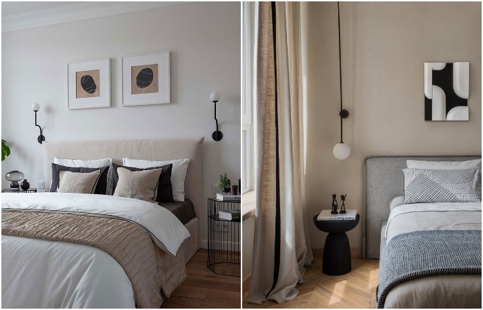 Если интерьер, оформленный в таких цветах, кажется вам слишком скучным, можете добавить акцентов. Как вариант – покрасить одну из стен в контрастный оттенок, необязательно яркий. Лучше выбирать тона, которые встречаются в природе – они выглядят намного уютнее. Можно, конечно, покрасить акцентную стену в интенсивный цвет, который уравновешивает освещение в комнате. Но и здесь тоже следует выбирать тона, которые встречаются в природе. Например, темно-красный или глубокий синий.