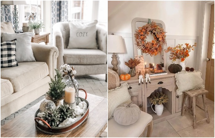 У каждого сезона есть свое настроение и цветовая гамма, поэтому предлагаем не лениться и обновлять декор к каждому времени года. Например, для зимы характерны синие, голубые, серебристые, белые тона, для осени – оранжевые, желтые, коричневые, для весны и лета – зеленые. Также не забывает украшать квартиру к праздникам. На Новый год не ограничивайтесь елкой: сделайте гирлянду из флажков, на дверь повесьте рождественский венок, а на стол поставьте красивую хвойную композицию в вазе или в горшке.